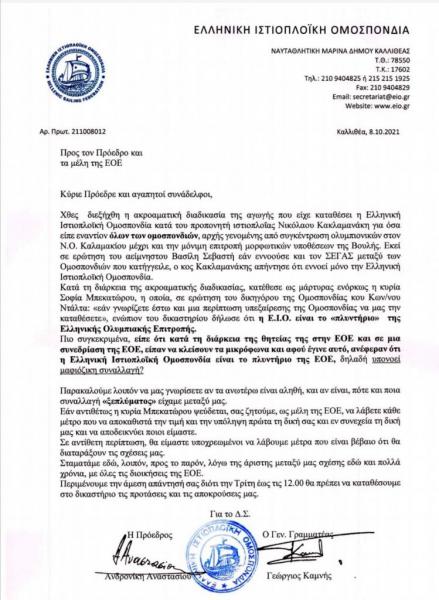 H Eλληνική Ολυμπιακή Επιτροπή απάντησε στην επιστολή της Ελληνικής Ιστιοπλοϊκής Ομοσπονδίας, στην οποία έμπαινε στο στόχαστρο η «χρυσή» Ολυμπιονίκης, Σοφία Μπεκατώρου, για την κατάθεση της ως μάρτυρος υπεράσπισης του προπονητή ιστιοπλοΐας, Νικόλα Κακλαμανάκη, στην αγωγή που κατέθεσε η ΕΙΟ κατά του τελευταίου.