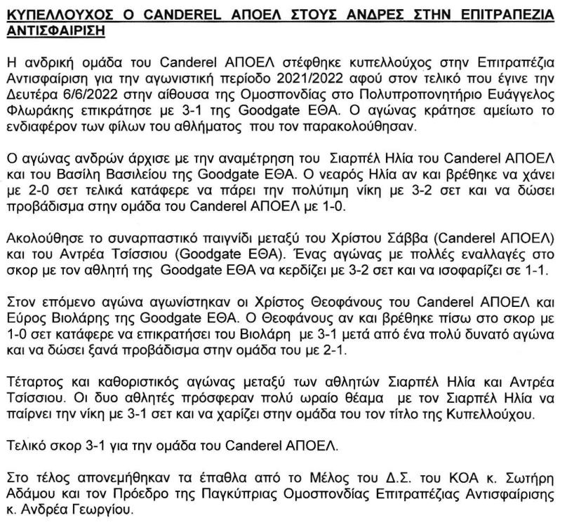Πήρε τον τίτλο ο ΑΠΟΕΛ (pic) ΑΛΛΑ ΑΘΛΗΜΑΤΑ ΑΠΟΕΛ 07.06.202210:30 Ακολουθεί Δελτίο Τύπου για την επιτραπέζια αντισφαίριση. Κυπελλούχος ο ΑΠΟΕΛ. Αναλυτικά: screenshot_2022-06-07_102825.png