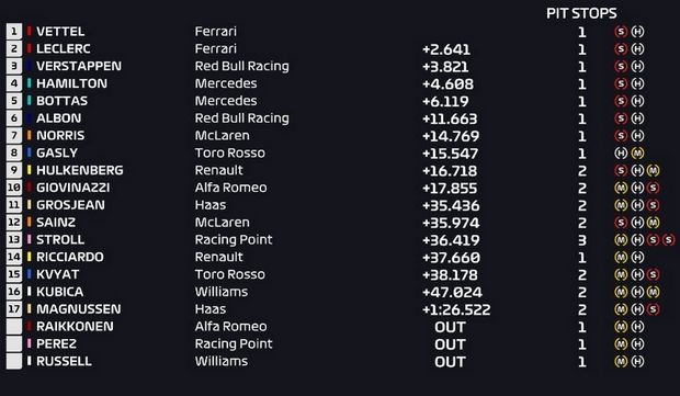 Αυτή η στρατηγική της Ferrari έδωσε την ευκαιρία στους δύο οδηγούς της να ξεπεράσουν τον Χάμιλτον, αλλά έδωσε και στον Φέτελ την πρωτοπορία στον αγώνα! Ο Γερμανός εκμεταλλεύτηκε το γεγονός ότι ο Λεκλέρκ συνάντησε κίνηση στο γύρο που έμεινε εκτός πίστας και έτσι τον προσπέρασε κάτι που εξόργισε τον Μονεγάσκο.