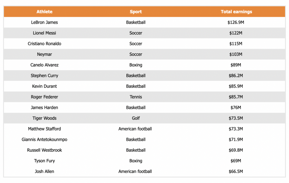 Η πρωτιά της σχετικής λίστας ανήκει στον Λεμπρόν Τζέιμς (126,9 εκατ. δολ.), με τον Λιονέλ Μέσι (122 εκατ. δολ.) και τον Κριστιάνο Ρονάλντο (115 εκατ. δολ.) να τον ακολουθούν.