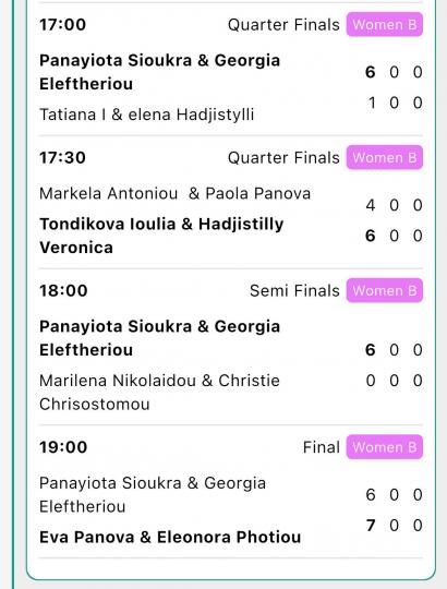 Στη γυναικεία κατηγορία, ο τελικός ήταν σχετικά εύκολη υπόθεση, με τις Πάνοβα και Φωτίου να προσθέτουν έναν ακόμη τίτλο στο ενεργητικό τους. Απέναντι στις ιδιαίτερα ανταγωνιστικές αθλήτριες, Σιούκρα και Ελευθερίου, χρειάστηκαν να «καθαρίσουν» με 1-0 (6-2), όπου μίλησε η εμπειρία και η καλύτερη διαχείριση στα games. Το τελικό σκορ, φανερώνει ότι το ζευγάρι των Πάνοβα/Φωτίου βρίσκεται εξαιρετική και έχει διάρκεια στις λύσεις που αναζητά μέσα court, σε έναν τελικό που κέρδισε το θερμό χειροκρότημα των θεατών, καθώς τα κορίτσια έπαιξαν ένα σετ, λόγω της ιδιαιτερότητας του προγράμματος.