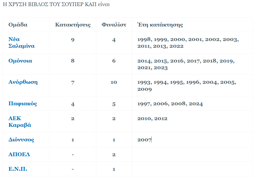 Πολυνίκης του θεσμού είναι η ΝΕΑ ΣΑΛΑΜΙΝΑ με 9 κατακτήσεις. Το πρώτο Σούπερ Καπ διοργανώθηκε το 1993 στην Κλειστή Αίθουσα ‘’ΟΛΥΜΠΙΑ’’ στη Λεμεσό όπου η ΑΝΟΡΘΩΣΙΣ κέρδισε τη ΝΕΑ ΣΑΛΑΜΙΝΑ με 3-0 σετ. Το Σούπερ Καπ επιστρέφει στην Πάφο μετά από 23 χρόνια αφού η μοναδική φορά που διεξήχθη στην πόλη ήταν το 2002 όταν η ΝΕΑ ΣΑΛΑΜΙΝΑ κέρδισε τον Α.Ο. ΔΙΟΝΥΣΟ με 3-0 .