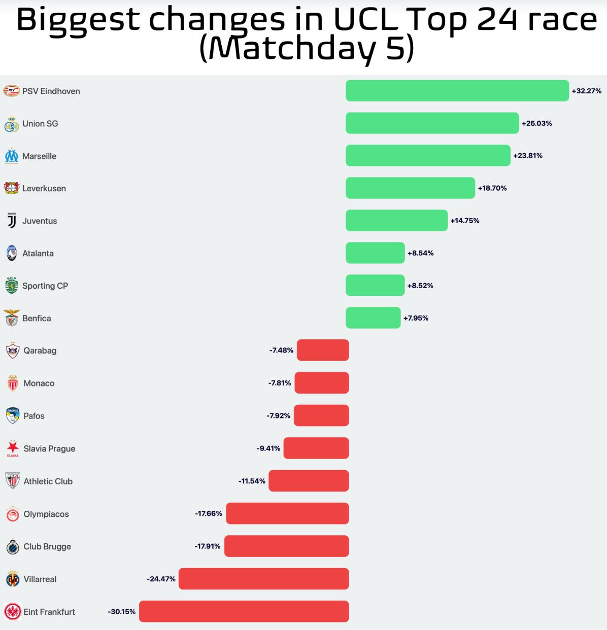 Σύμφωνα με τις εκτιμήσεις, οι «γαλάζιοι» έχουν πλέον -7,92% να βρεθούν στην πρώτη 24άδα με το πέρας της league phase. Σημειώνεται πως δεν είναι η πρώτη φορά που δίνονται -από πλευράς στατιστικής- τέτοιες δυσοίωνες προβλέψεις για την Πάφο, η οποία μέχρι στιγμής έχει καταφέρει να τις διαψεύσει στον αγωνιστικό χώρο όλες.