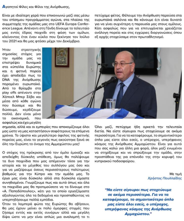 Πουλλαΐδης: «Η φετινή πορεία έχει αποδείξει...» EUROPA CONFERENCE LEAGUE ΑΝΟΡΘΩΣΗ 25.11.202115:01 Ο Χρίστος Πουλλαΐδης μέσω του επίσημου περιοδικού της Ανόρθωσης έστειλε το δικό του μήνυμα στον κόσμο της ομάδας. Αναλυτικά: 260742879_199008045729136_2284940314053115531_n.png