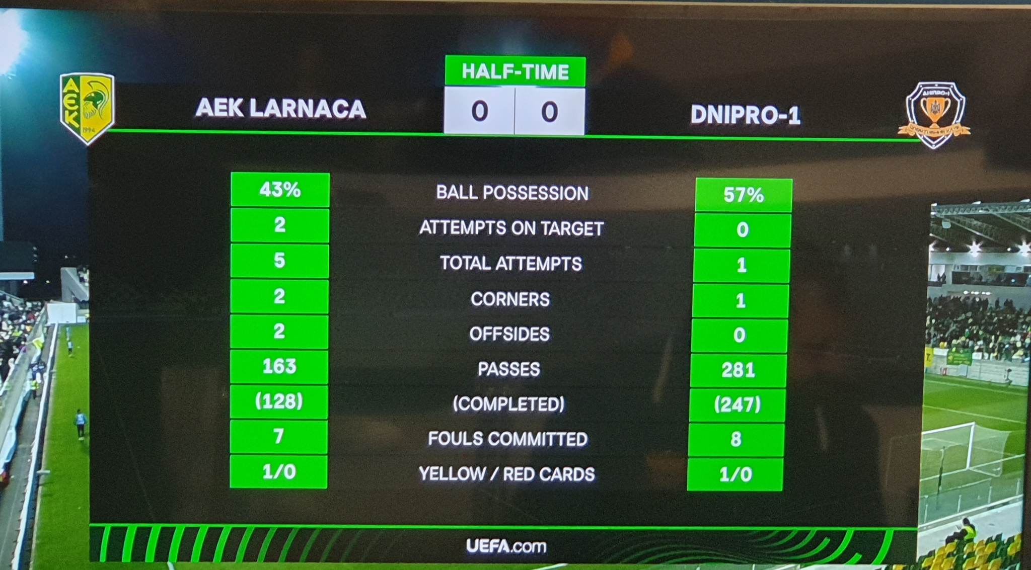 Δείτε πιο κάτω τα στατιστικά του ημιχρόνου ΑΕΚ-Ντίμπρο με το σκορ να είναι στο 0-0. Δύο προσπάθειες στο στόχο για ΑΕΚ, καμία για Ντίμπρο.