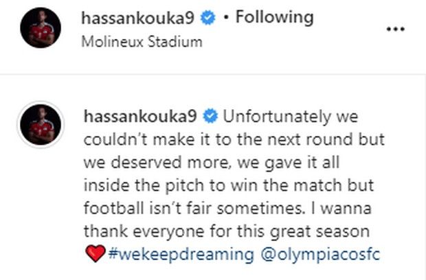 Ο Αχμέντ Χασάν μπήκε στο 65' του αγώνα με τη Γουλβς και στο 81' έχασε τεράστια ευκαιρία για να σκοράρει. Η κεφαλιά του αποκρούστηκε από τον Ρουί Πατρίσιο. Μία μέρα μετά τον αποκλεισμό του Ολυμπιακού (ήττα 1-0), ο Αιγύπτιος έγραψε στο instagram: