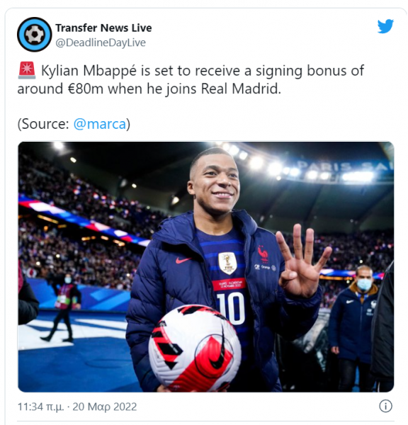 Διατεθειμένη να προσφέρει μέχρι και 80 εκατομμύρια ευρώ μπόνους υπογραφής στον Κιλιάν Μπαπέ, προκειμένου να υπογράψει σε αυτή στο τέλος της σεζόν είναι η Ρεάλ.
