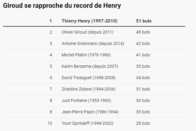 Ο άσος της Μίλαν βρίσκεται πλέον πολύ κοντά στο ρεκόρ του Τιερί Ανρί ο οποίος είναι στην 1η θέση των κορυφαίων σκόρερ όλων των εποχών της Γαλλίας με 51 γκολ, με την διαφορά να είναι πλέον στα τρία τέρματα.