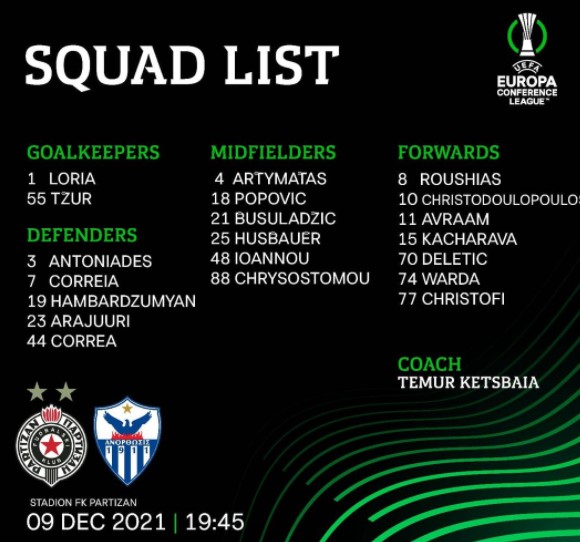 Τρεις αναμενόμενες και μια απρόσμενη απουσία περιλαμβάνει η αποστολή της Ανόρθωσης για το Βελιγράδι, όπου το βράδυ της Πέμπτης (9.12) αντιμετωπίζει την Παρτίζαν σ' έναν αγώνα-τελικό για τη δεύτερη θέση στον όμιλο και την πρόκριση στη νοκ άουτ φάση του Κόνφερενς Λιγκ.