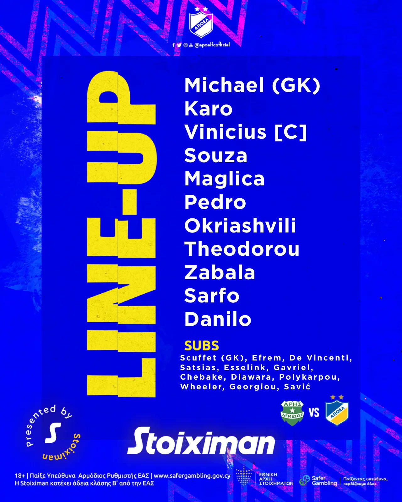 ΑΠΟΕΛ: Μιχαήλ - Πέδρο, Καρώ, Βινίσιους, Σαμπάλα - Σόουζα, Σαρφό, Ντανίλο - Θεοδώρου, Οκριασβίλι - Μάγκλιτσα.
