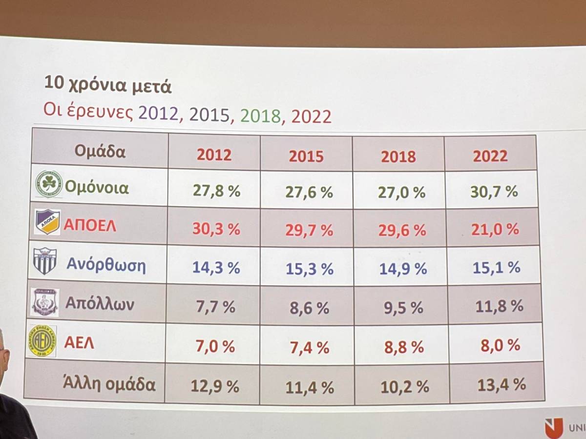 Οι αριθμοί επιβεβαίωσαν το προφανές. Η Ομόνοια είναι με διαφορά η δημοφιλέστερη ομάδα της Κύπρου σύμφωνα και με τα αποτελέσματα της μεγάλης έρευνας του Πανεπιστημίου Λευκωσίας υπό τον τίτλο «Κυπριακό Ποδόσφαιρο: Ποσοστά Υποστήριξης Ποδοσφαιρικών Ομάδων 2022».