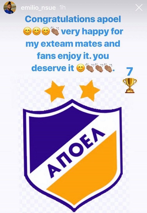"Συγχαρητήρια ΑΠΟΕΛ. Πολύ χαρούμενος για τους πρώην συμπαίκτες μου και για τους οπαδούς. Απολαύστε το, το αξίζετε", αυτό αναφέρει ο πρώην παίκτης του ΑΠΟΕΛ Εμίλιο Νσούε.
