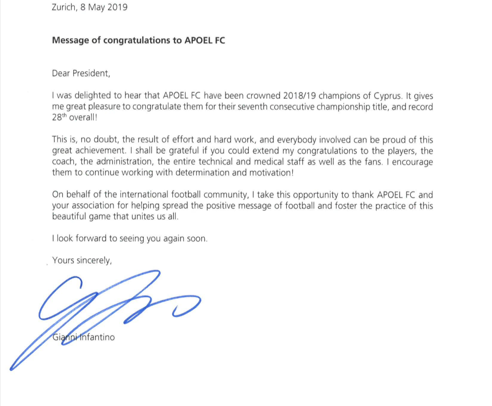 Με επιστολή του προς τον Πρόεδρο της ΚΟΠ Γιώργο Κούμα, ο Πρόεδρος της FIFA Τζιάνι Ινφαντίνο, τον καλεί να διαβιβάσει τα συγχαρητήρια του προς το ΑΠΟΕΛ.για την κατάκτηση του Πρωταθλήματος Cyta.