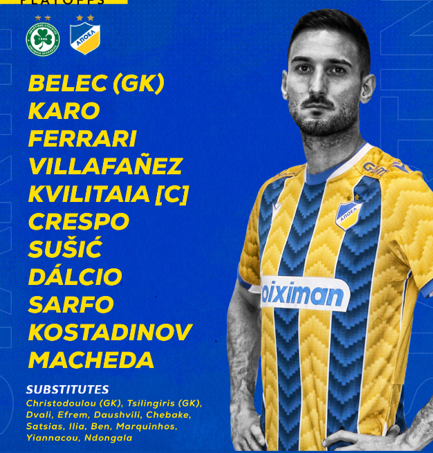 Στον πάγκο: Χριστοδούλου, Τσιλιγκίρης, Ντβάλι, Εφραίμ, Νταουσβίλι, Τσεμπάκ, Σατσιάς, Ηλία, Μπεν, Μαρκίνιος, Γιαννακού, Ντονγκαλά.