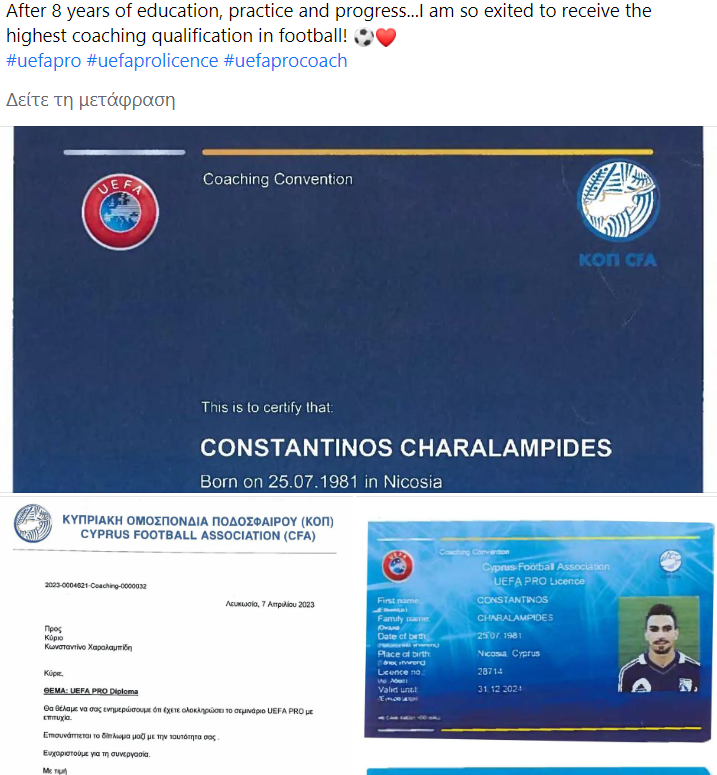 Ο Κωνσταντίνος Χαραλαμπίδης με την πιο κάτω ανάρτηση ενημερώνει πως έλαβε και επίσημα το δίπλωμα Uefa PRO.