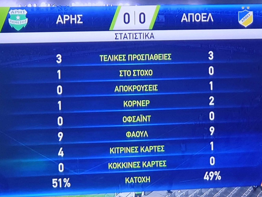 Ισόπαλο 0-0 ολοκληρώθηκε το πρώτο ημίχρονο ανάμεσα στον Άρη και τον ΑΠΟΕΛ. Με βάση τους αριθμούς, το πρώτο 45λεπτό στη Λεμεσό ήταν μοιρασμένο και ισορροπημένο.