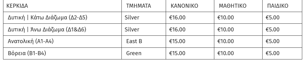 *στα τμήματα VIP, Platinum, Gold & East A εκδίδονται μόνον Εισιτήρια Διαρκείας