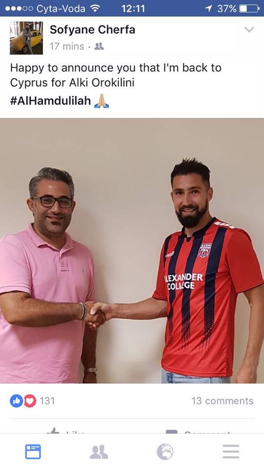 H επιστροφή του Σοφιάν Σερφά στα κυπριακά γήπεδα επισημοποίηθηκε και ο ίδιος θέλησε να το μοιραστεί με τους διαδυχτιακούς του φίλους. Ο Αλγερινός αμυντικός της Αλκής πλέον έγραψε: "Εϊμαι χαρούμενος που ανακοινώνω την επιστροφή μου στην Κύπρο για την Αλκή"