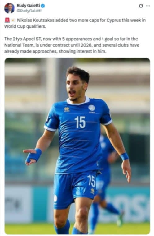 Ο δημοσιογράφος Ρούντι Γκαλέτι με ανάρτηση του στον προσωπικό του λογαριασμό στο X, κάνει αναφορά στις παρουσίες του Κούτσακου στην Εθνική ομάδα αλλά και το φετινό ξεκίνημα του στον ΑΠΟΕΛ. Επιπλέον υπενθυμίζει ότι το συμβόλαιο του με τον ΑΠΟΕΛ λήγει το καλοκαίρι του 2026 και πως ήδη κάποιες ομάδες έχουν δείξει ενδιαφέρον για την περίπτωση του Κύπριου επιθετικού.