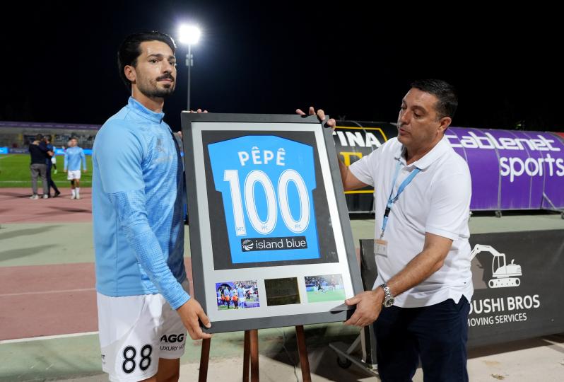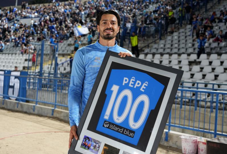 Ο Πορτογάλος μέσος συμπληρώνει σήμερα 100 παιχνίδια με τη φανέλα της Πάφου σε όλες τις διοργανώσεις, με 7 γκολ και 12 ασιστ. Η διοίκηση της Πάφου δεν θα μπορούσε να μην βραβεύσει έναν από τους πιο πολύτιμους ποδοσφαιριστές της, με τον Πέπε να παραλαμβάνει την τιμητική φανέλα των... 100 αγώνων.