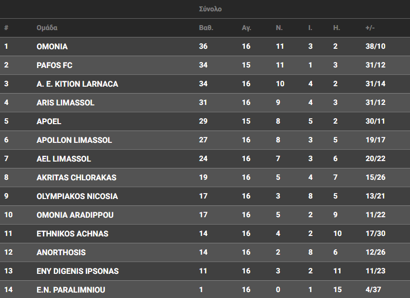 Στο «AlphaMega Stadium» η ΑΕΛ υποδέχεται στις 19:00 την Ομόνοια. Η ομάδα της Λεμεσού που βρίσκεται στην 7η θέση με 24 βαθμούς θέλει τη νίκη έτσι ώστε να κρατήσει επαφή με την εξάδα. Από την άλλη οι «πράσινοι» της Λευκωσίας, βρίσκονται στη κορυφή με 36 βαθμούς (αγώνα περισσότερο από την Πάφο) και θα προσπαθήσουν να ντουμπλάρουν τις νίκες τους κόντρα στην ΑΕΛ και να παραμείνουν στην πρώτη θέση.