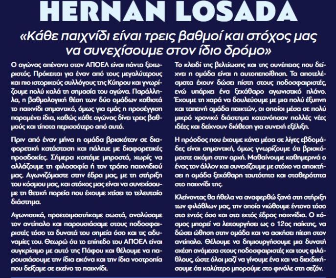Ο Απόλλωνας είναι έτοιμος για το «μεγάλο» ντέρμπι με τον ΑΠΟΕΛ στο «Alphamega», σε ένα παιχνίδι που συνδυάζει ιστορία, ένταση και σημαντικό βαθμολογικό διακύβευμα. Ο Ερνάν Λοσάδα, μετρημένος στις τοποθετήσεις του, έστειλε ξεκάθαρο μήνυμα ότι η ομάδα του δεν πρόκειται να παρεκκλίνει από τη φιλοσοφία της.