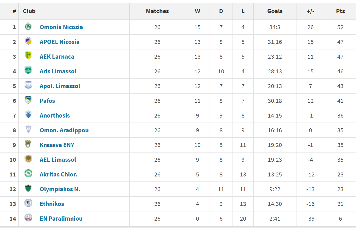 Η Ομόνοια παραμένει στην κορυφή και σε αυτή την ειδική βαθμολογία, αλλά με εννέα βαθμούς λιγότερους, ενώ ακολουθούν ο ΑΠΟΕΛ και η ΑΕΚ στους 47 βαθμούς. Ο Απόλλωνας μαζί με την Πάφο παρουσιάζουν τη μεγαλύτερη πτώση, έχοντας δέκα βαθμούς λιγότερους από την κανονική τους συγκομιδή, παρά το γεγονός ότι οι ομάδες της πρώτης εξάδας παραμένουν οι ίδιες.