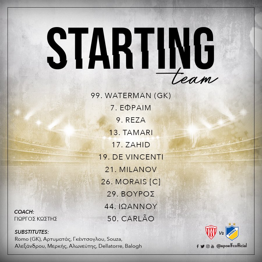 Ντεμπούτο Κωστή στον πάγκο του ΑΠΟΕΛ σήμερα και ο Ελλαδίτης τεχνικός στον πρώτο του καταρτισμό ενδεκάδας, προχώρησε σε δύο αλλαγές παικτών. Στην ενδεκάδα μπήκαν οι Ντε Βινσέντι και Μιλάνοφ, εκτός ο τραυματίας ΜΙλάνοφ και ο Σόουζα που έμεινε στον πάγκο.