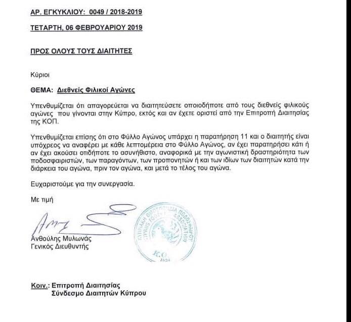 Η ΚΟΠ με επιστολή υπενθυμίζει στους διαιτητές ότι απαγορεύεται να διευθύνουν διεθνείς φιλικούς αγώνες που διεξάγονται στην Κύπρο εκτός και αν έχουν οριστεί από την Επιτροπή Διαιτησίας.