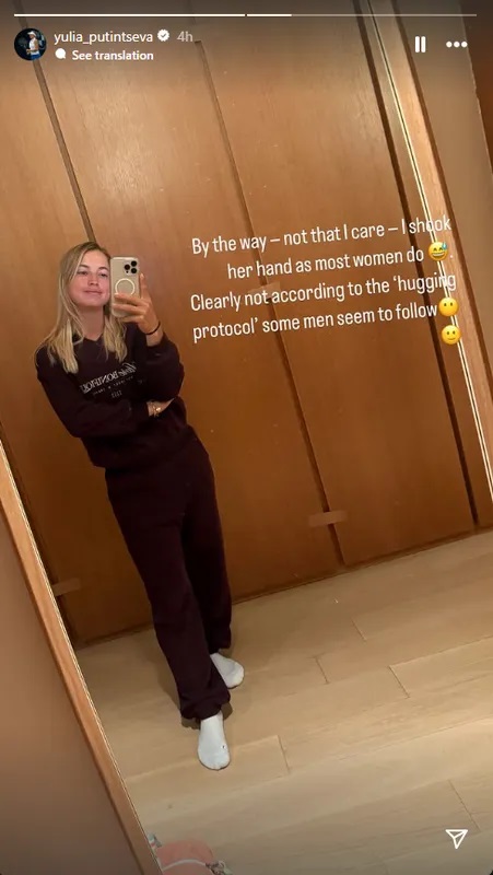 Η Πουτίντσεβα απάντησε μέσω Instagram, δημοσιεύοντας δύο stories. Στο πρώτο, παρουσίασε φωτογραφίες της Σάκκαρη σε παρόμοιες στιγμές με τις Έμα Ραντουκάνου και Μαρτίνα Τρέβιζαν, όπου επίσης δεν υπήρξε οπτική επαφή κατά τη χειραψία. Στο δεύτερο story, ανήρτησε δική της φωτογραφία με τη λεζάντα: «Παρεμπιπτόντως -όχι ότι με νοιάζει- της έδωσα το χέρι, όπως κάνουν οι περισσότερες γυναίκες. Προφανώς όχι σύμφωνα με το ''πρωτόκολλο αγκαλιάς'' που φαίνεται να ακολουθούν μερικοί άνδρες».